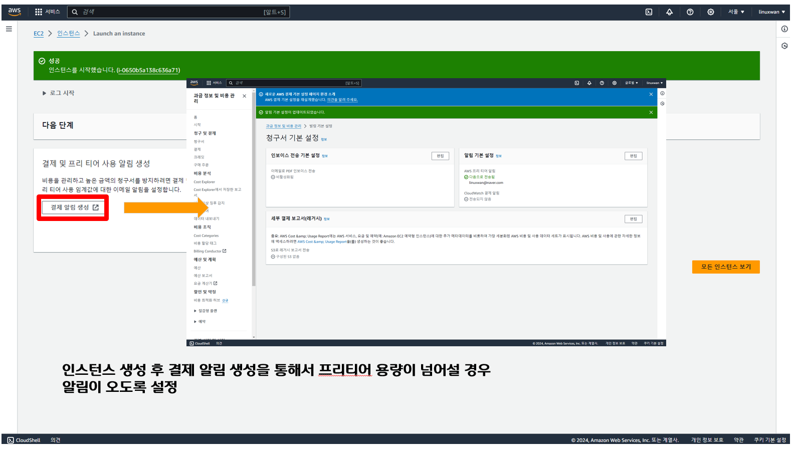 인스턴스 생성 후 결제 알림 설정을 통해서 프리티어 용량이 넘어설 경우 알림이 오도록 설정한다.