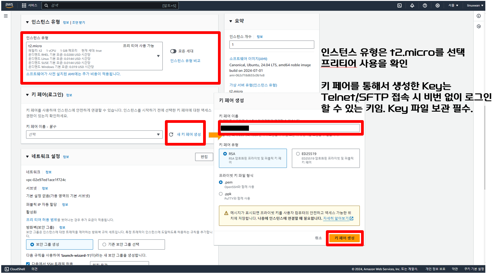새 키페어 생성을 통해서 Key 파일을 만든다. 이 Key 파일은 향 후 EC2 서버와 Telnet/SFTP 접속 시 비번 없이 로그인을 할 수 있도록 도와주는 Key이니 잘 보관하도록 하자. Key 파일 생성 및 보관은 필수.