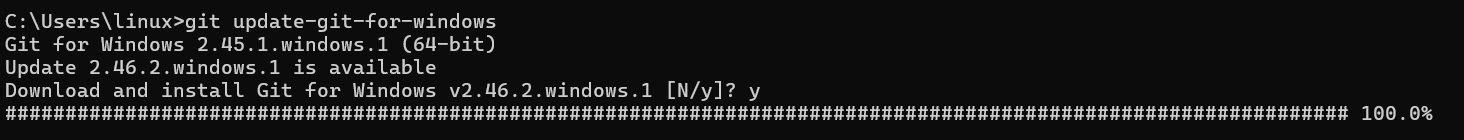 CMD 또는 Windows PowerShell 을 실행해서 아래와 같은 명령어로 Git 을 업데이트 한다.