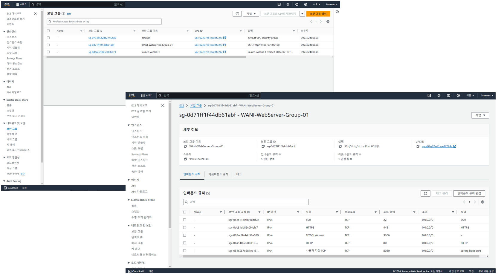 기본 보안 그룹 설정을 제거하고 좀 전에 새로 생성한 보안 그룹으로 대체하도록 한다.