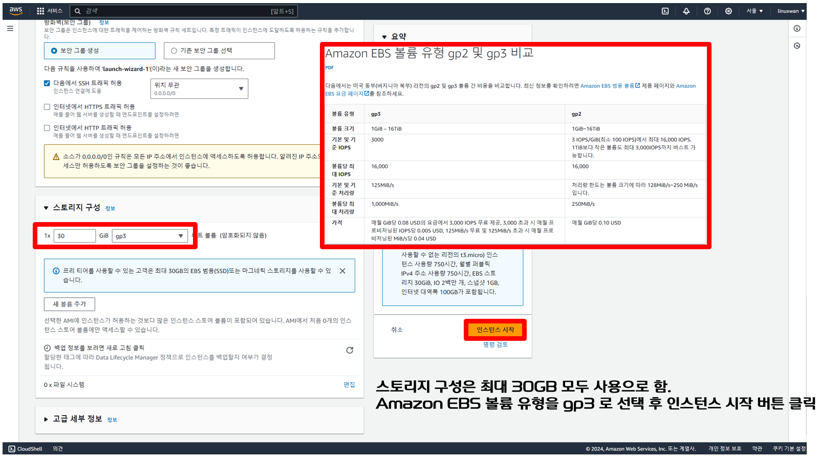비용이나 성능으로 보더라도 gp3 나으므로 gp3을 선택하도록 한다. 스토리지 사이즈는 최대 30기가 이므로 30기가 모두를 설정하도록 한다.