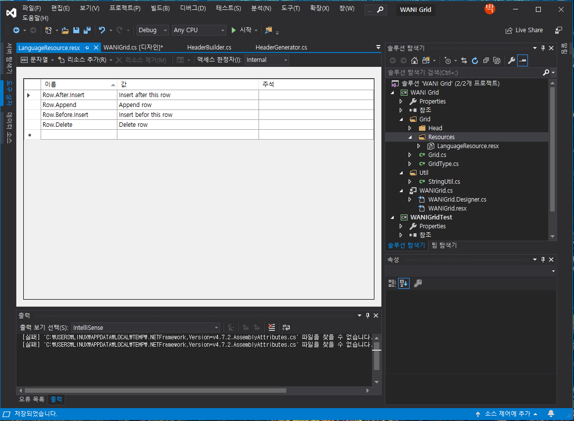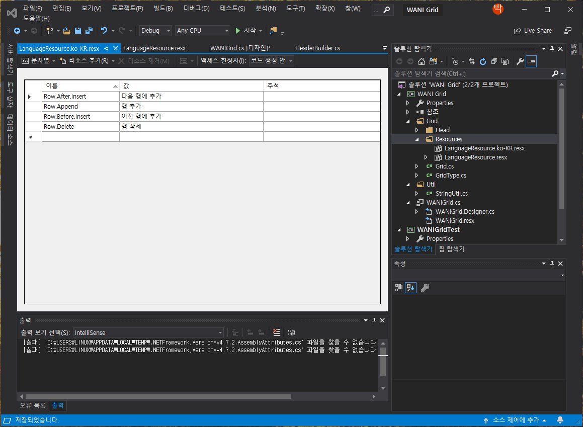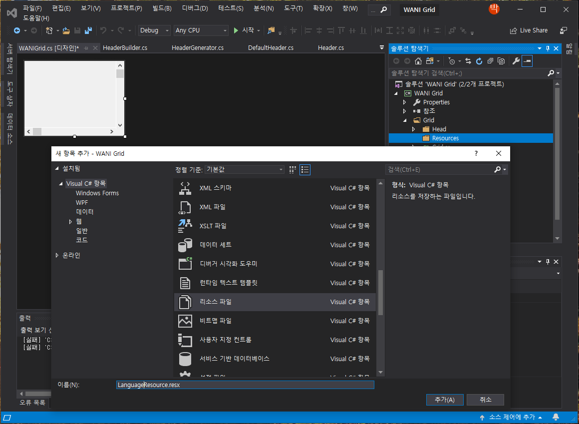 한글과 영문으로 제공하기 위해서 Resource파일들을 WANI Grid 프로젝트의 Resources폴더 아래에 만든다.
