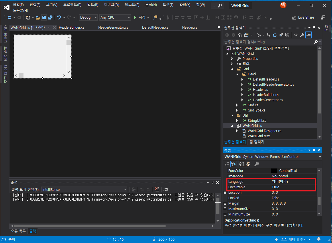 WANIGrid Control의 속성 중 다국어 지원을 위해서 Language와 Localizable 속성에 아래와 같이 값을 설정한다.