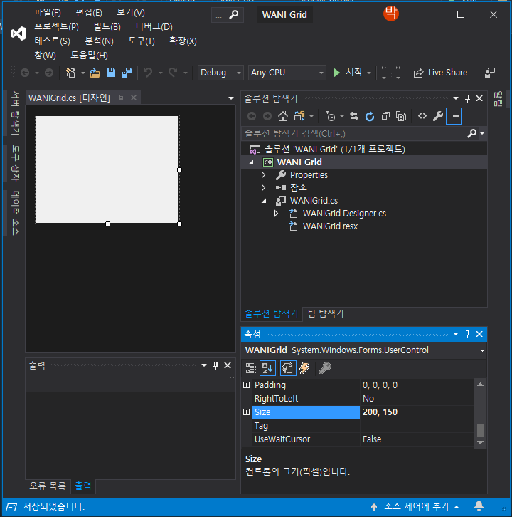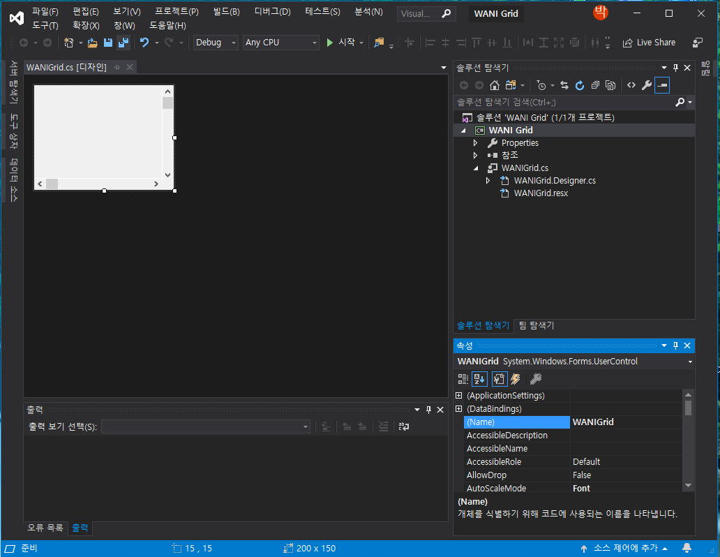 WANIGrid Control의 사이즈는 기본적으로 Width: 200, Height: 150 으로 설정한다.