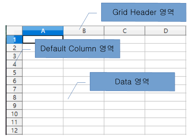 맨 첫번째 영역인 Default Column, Grid Header 영역은 각 컬럼의 데이터 속성을 대표하는 타이틀을 보여주는 Header영역과 Row와 Column별로 구분되어 실제 데이터를 입력 받거나 보여주기 위한 Data 영역으로 구성된다.