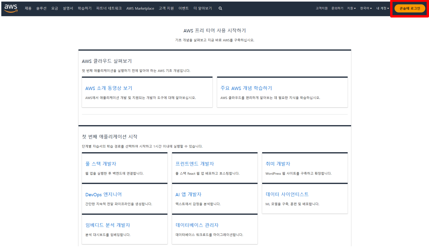우측 상단의 [콘솔에 로그인] 버튼을 선택해서 로그인 하도록 한다.