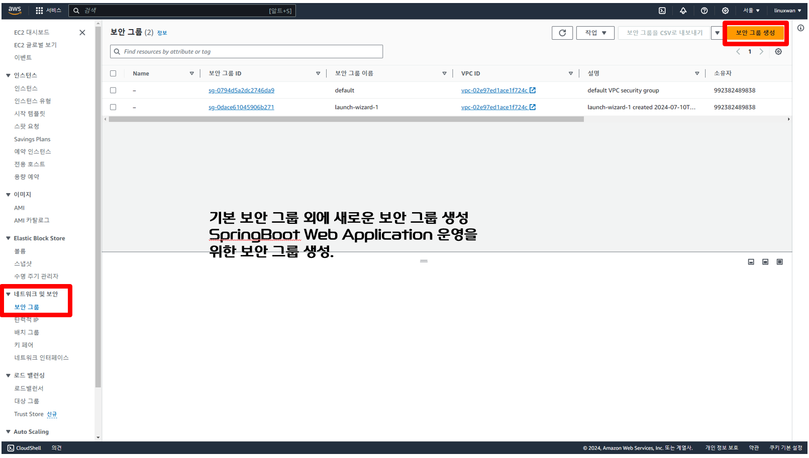 네트워크 및 보안의 보안 그룹을 선택해서 보안 그룹을 새로 생성하도록 한다.