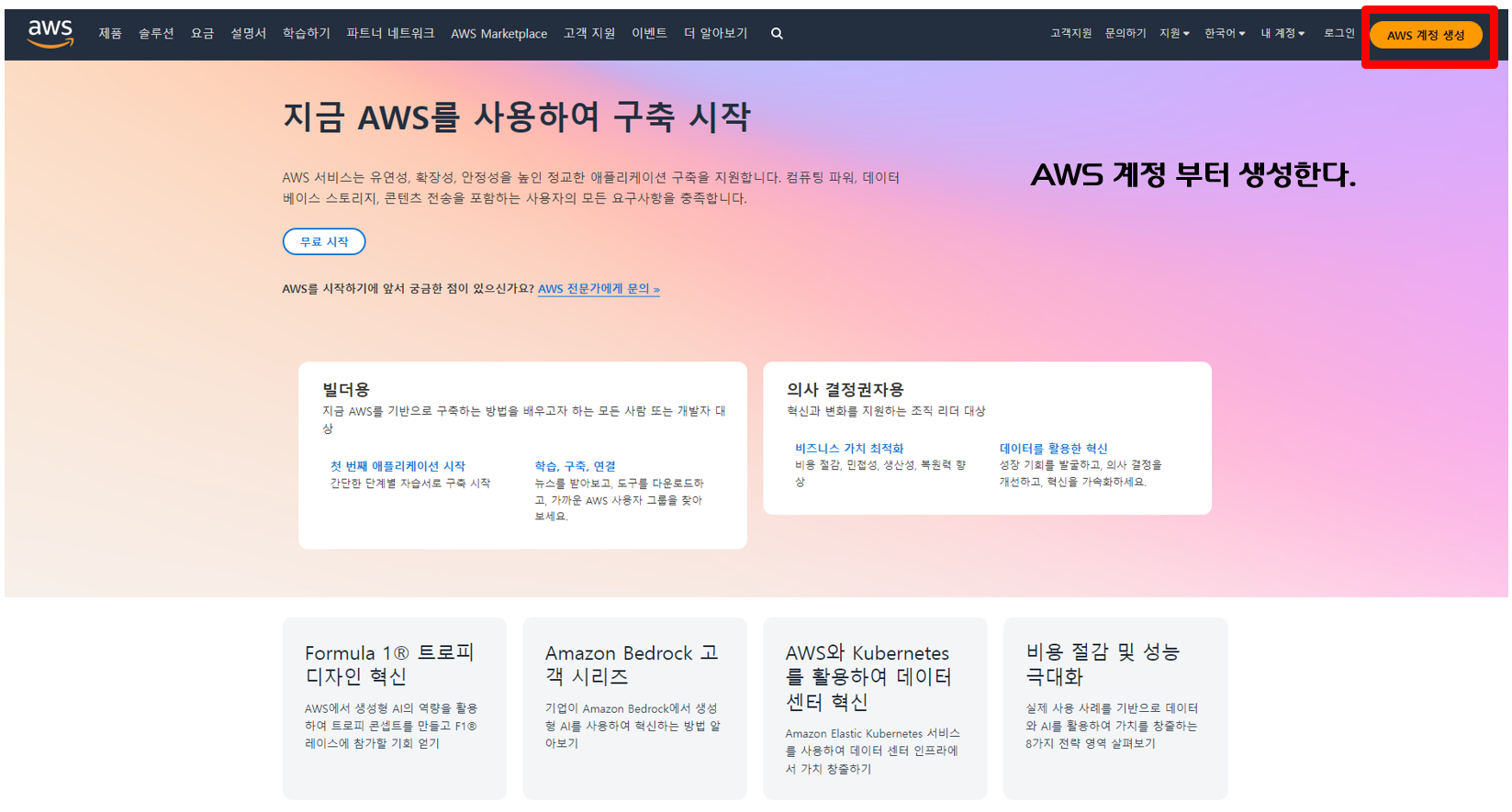 https://aws.amazon.com 사이트에 접속해서 AWS 계정을 생성하기로 한다.