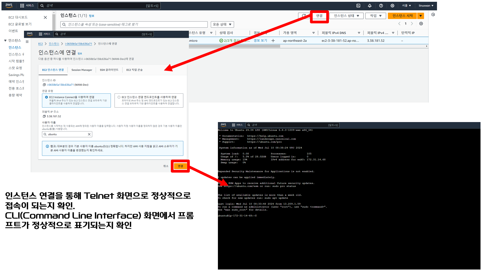 Telnet 콘솔 화면이 정상적으로 나타나면 EC2 서버 설정이 정상적으로 이루어진 것이다.