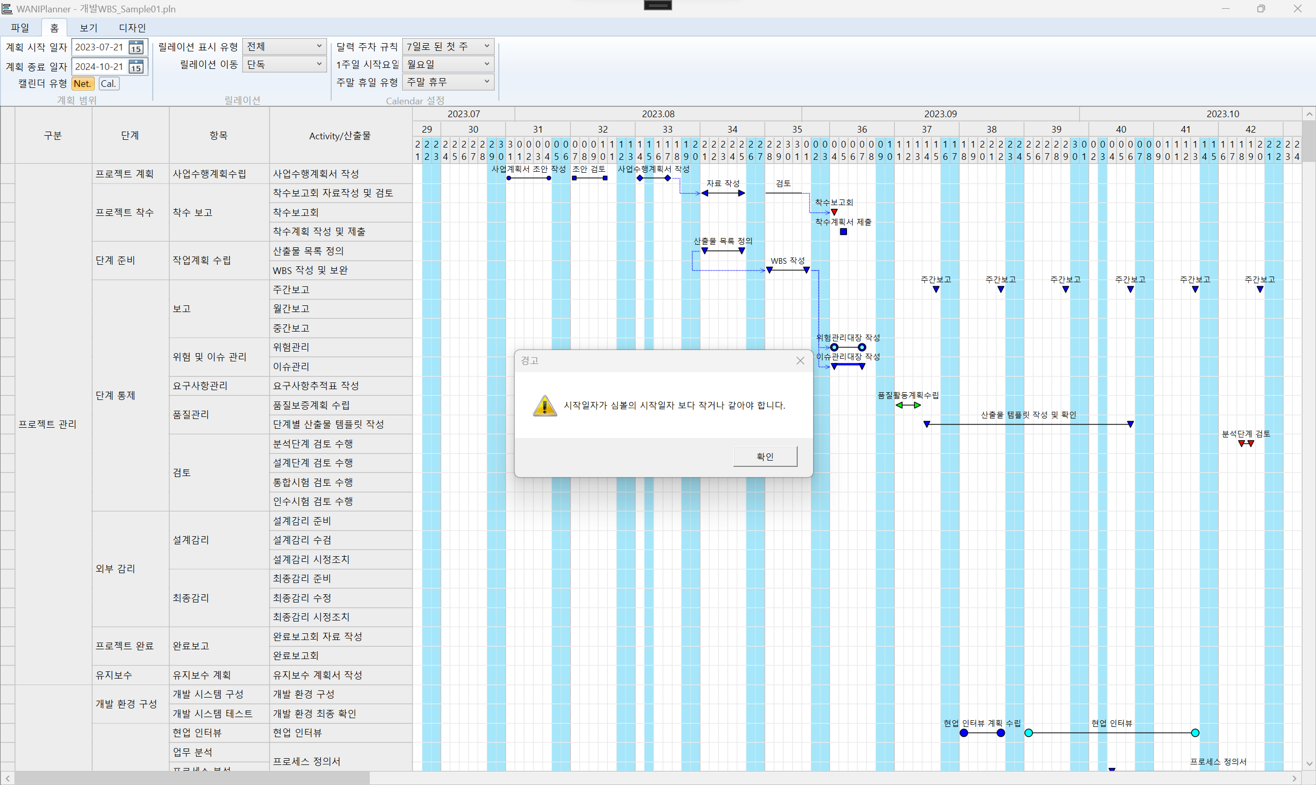 기존 버전에서 Activity(심볼)의 시작/종료 체크 없이 일정계획의 시작과 종료일자가 변경되었던 부분을 일자 변경 시 이미 생성된 Activity의 시작/종료 일자를 체크해서 변경되는 일자가 Activity(심볼)의 시작/종료 일자 범위를 벗어나는 경우 메시지로 이러한 사실을 알리고 변경이 되지 않도록 처리했다.