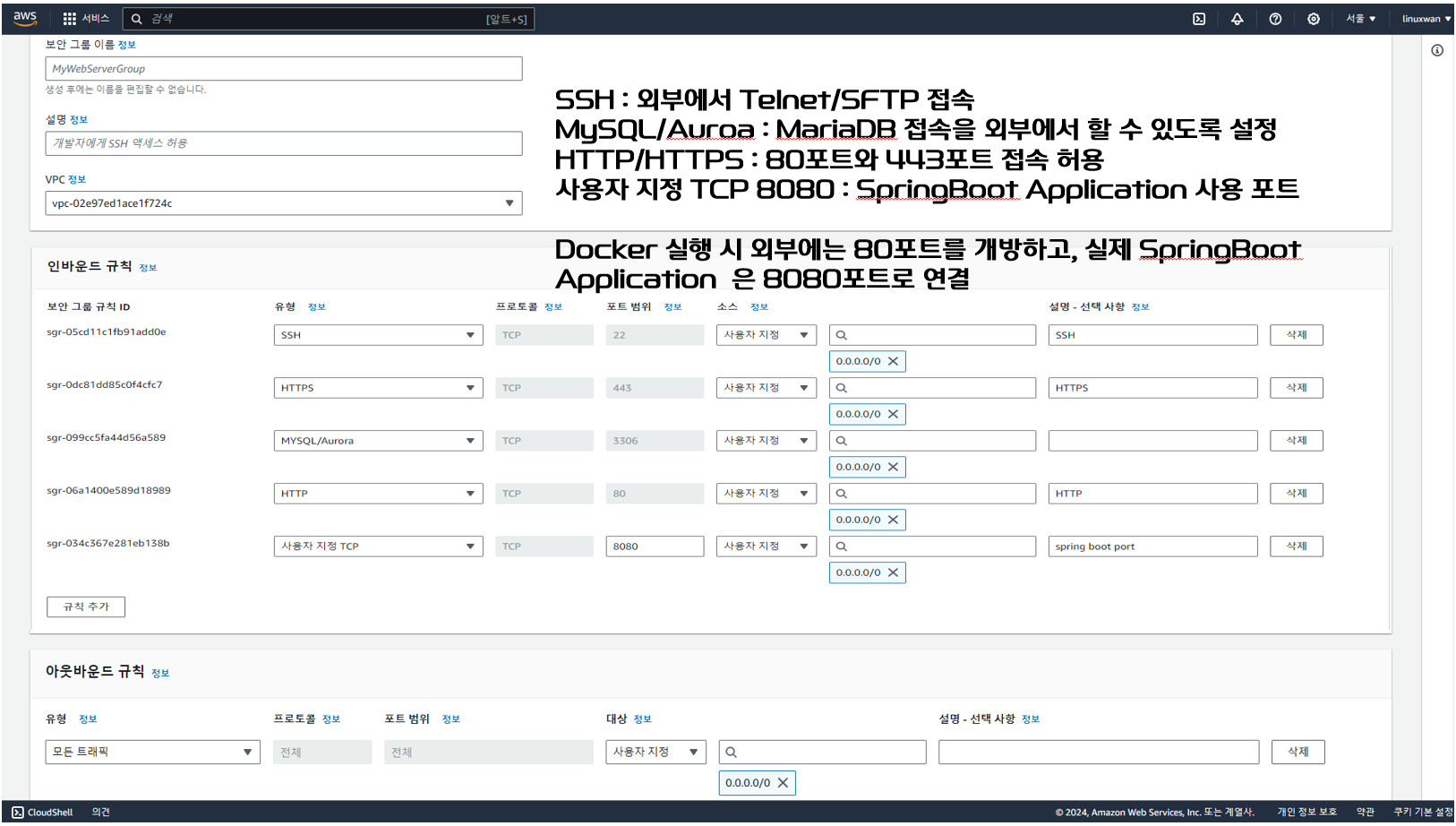 보안 그룹 생성 시 SSH, HTTPS, MySQL/Aurora, HTTP, 사용자 지정 TCP를 추가하도록 한다.