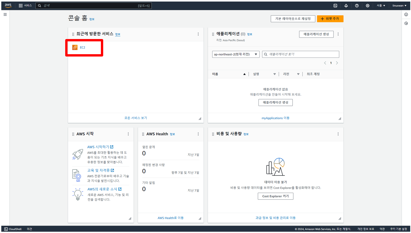 콘솔 로그인 후 콘솔 홈에서 EC2를 선택한다.