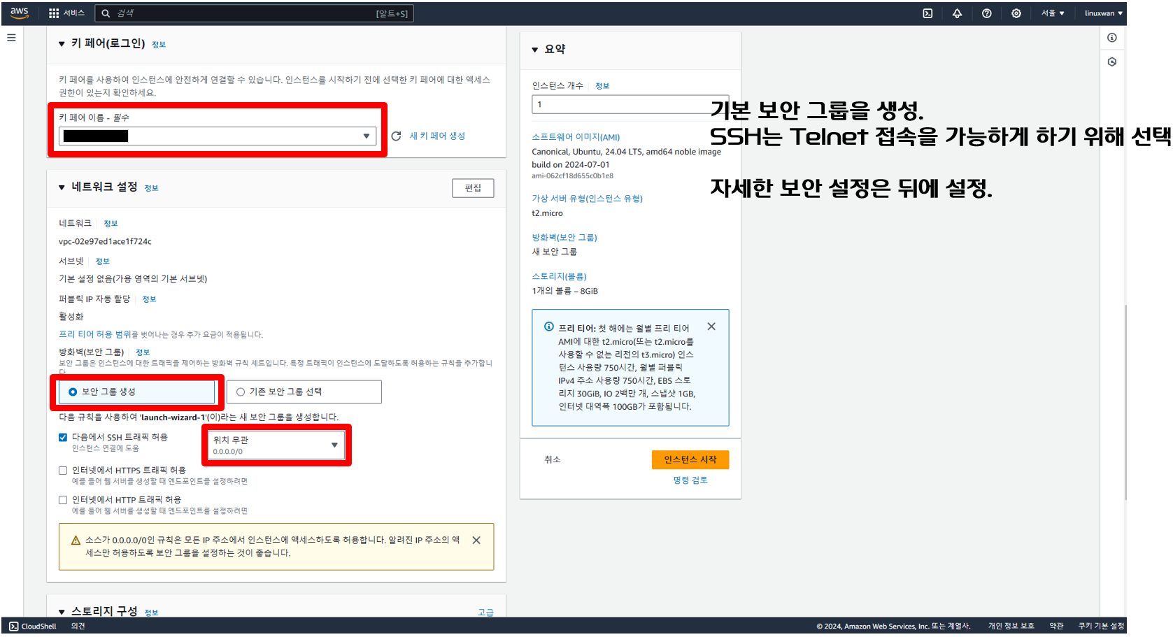 기존 보안 그룹 선택 대신 보안 그룹 생성을 선택해서 SSH 트래픽 허용을 체크하고 위치 무관을 선택하도록 한다.