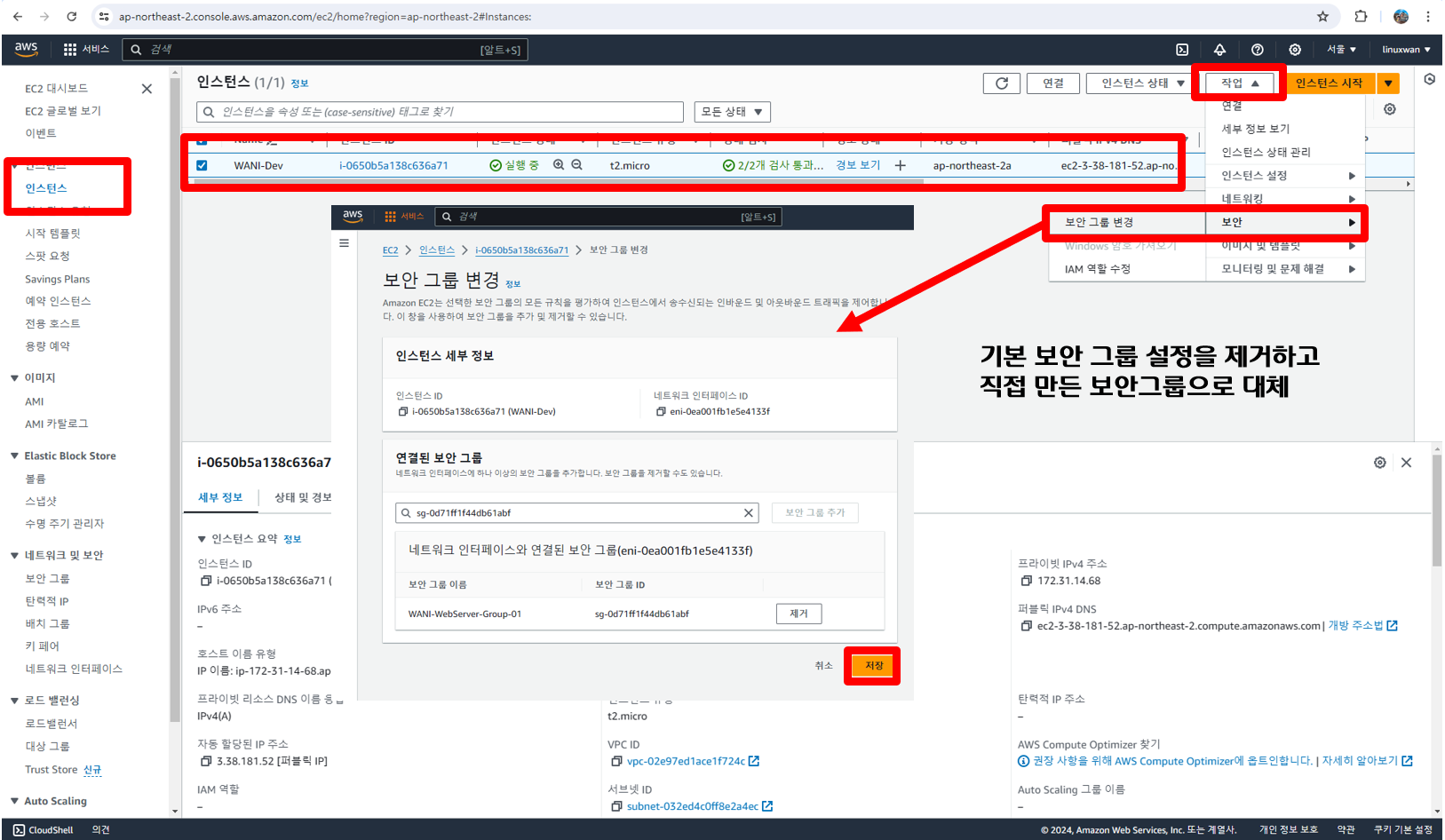 기본 보안 그룹 설정을 제거하고 좀 전에 새로 생성한 보안 그룹으로 대체하도록 한다.